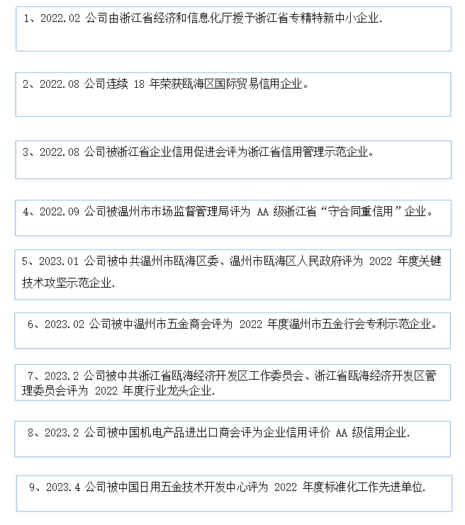 公司于 2002 年被認(rèn)定中國(guó)日用技術(shù)研究開發(fā)中心為“中國(guó)自行車鎖具中心”,2003 年浙江省經(jīng)信委認(rèn)定公司技術(shù)中心為“省級(jí)企業(yè)技術(shù)中心”,2004年浙江省科技廳認(rèn)定公司研發(fā)中心為“省級(jí)高新技術(shù)研究開發(fā)中心(新型鎖具)”, 2016 年溫州市經(jīng)信委認(rèn)定本公司設(shè)計(jì)中心為“市級(jí)工業(yè)設(shè)計(jì)中心”。2015 年設(shè)立有浙江省博士后工作站;并建有甌海區(qū)工匠大師工作室。2020 年再次通過國(guó)家高新技術(shù)企業(yè)復(fù)評(píng)。